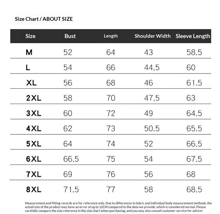 Sizes: M (recommended for 80–100 jin), L (recommended for 100–120 jin), XL (recommended for 120–135 jin), 2XL (recommended for 135–150 jin), 3XL (recommended for 150–165 jin), 4XL (recommended for 165–180 jin), 5XL (recommended for 180–200 jin), 6XL (recommended for 200–220 jin), 7XL (recommended for 220–240 jin), 8XL (recommended for 240–270 jin)